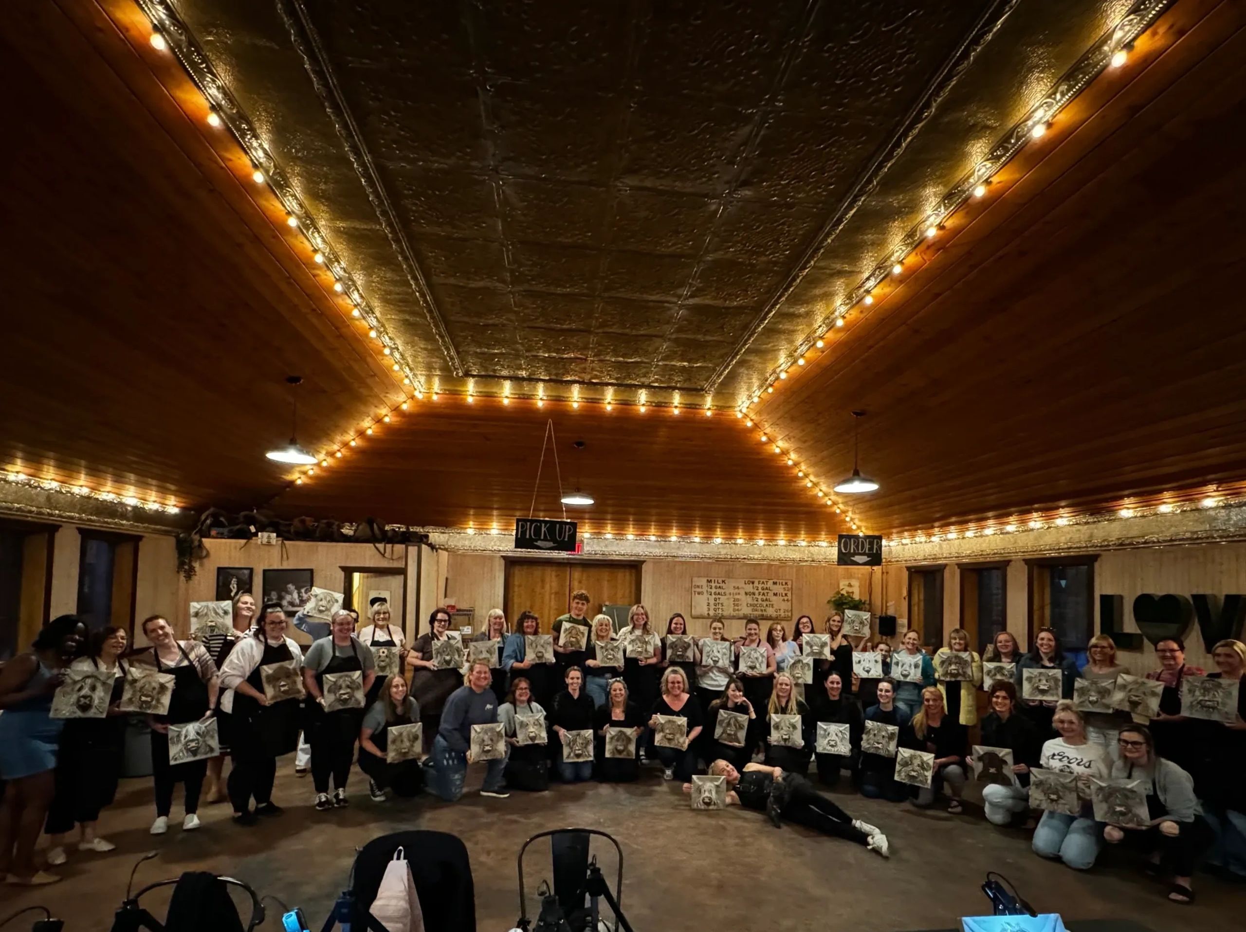 The painting portion of the event typically takes around 2.5-3 hours depending on the painting that is being done. For example the Cherry Blossom painting is on average 2.5 hours, vs. the Highland Steer is 3 hours. This time also includes any drawing portion as well. Then I like to take a group photo at the end of the event to show off everyone's beautiful artwork!